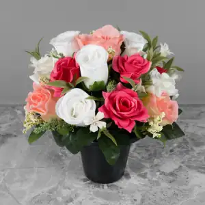 Artificial white rosebud, hot pink & white open roses, and pink roses, with gyp and greenery in a black plastic grave flower pot.